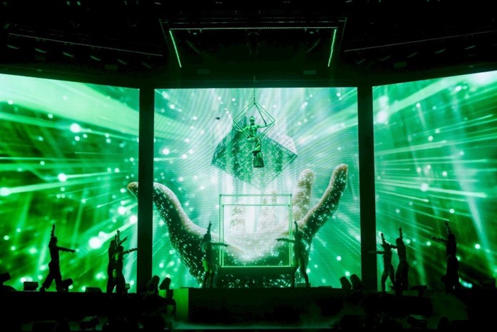 Ela já surgiu em cena sobre um jipe, cantando enquanto atravessava o palco em uma estética que remete diretamente a querida Lara Croft. Em outros momentos, apareceu suspensa a vários metros de altura, atravessando o espaço como parte da própria coreografia. Há trocas de cenário que redesenham o palco em tempo real, interações com o telão que ampliam a narrativa das músicas e movimentos precisos que fazem cada transição parecer calculada – mesmo quando tudo soa espontâneo.
